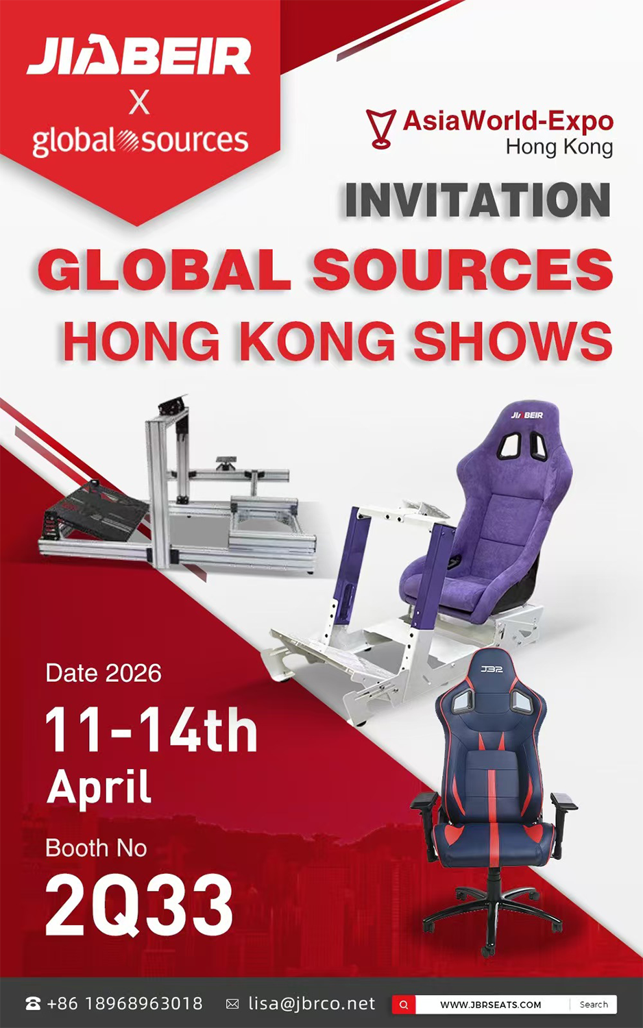 Del 11 al 14 de abril de 2026, JIABEIR exhibirá sus soportes de simulador de carreras, sillas de juego y otras líneas de productos recientemente mejorados en el Global Sources Hong Kong Show en AsiaWorld-Expo, Hong Kong (Sala No.: 2Q33). ¡Invitamos sinceramente a los clientes globales a visitar y discutir nuevas oportunidades en la industria!